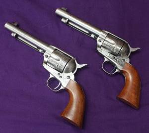 These guns are from a retired cowboy shooter, they are finished in nickel with engraving